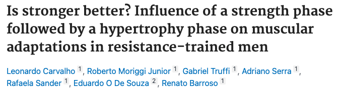 In an 8 week trial, Carvalho, et al. (2020) randomized subjects into one of two conditions. The experimental condition dedicated the first 3 weeks to “strength” work (i.e., sets with a 1-3RM load) followed by 5 weeks of “hypertrophy” training (i.e., 8-12RM loads) while the control group trained with 8-12RM loads for 8 weeks.The group that incorporated a low rep phase actually achieved greater hypertrophy and strength. The authors concluded that there may have been a potentiation effect and that the neurological adaptations achieved in the first phase allowed the subjects to use more weight in their moderate rep range work. Perhaps the deliberate change addressed a supporting system or process that may have limited their ability to maximize the following phase.